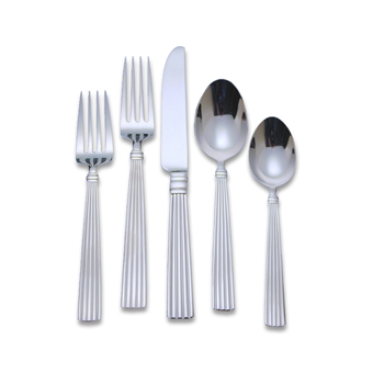 A dramatic pinstripe design distinguishes the handle of this grand pattern, which culminates in an elegant triple band at the throat. Includes twelve 5-Piece place settings, a 5-Piece hostess set and comes with a durable wooden flatware caddy, ideal for entertaining or storage.