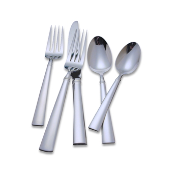 This contemporary, continental-size flatware pattern features a smooth, highly polished finish with a simple double band at the throat. Includes twelve 5-Piece place settings, a 5-Piece hostess set and comes with a durable wooden flatware caddy, ideal for entertaining or storage.