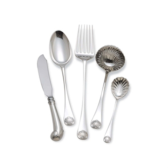 Williamsburg Shell, the height of fashion in the 1750s, reflects the Georgian love of symmetry and fascination with the natural world. This graceful pattern is an authentic reproduction from the premium WILLIAMSBURG Reserve Collection. Includes butter serving knife, serving spoon, cold meat fork, gravy ladle and sugar spoon.