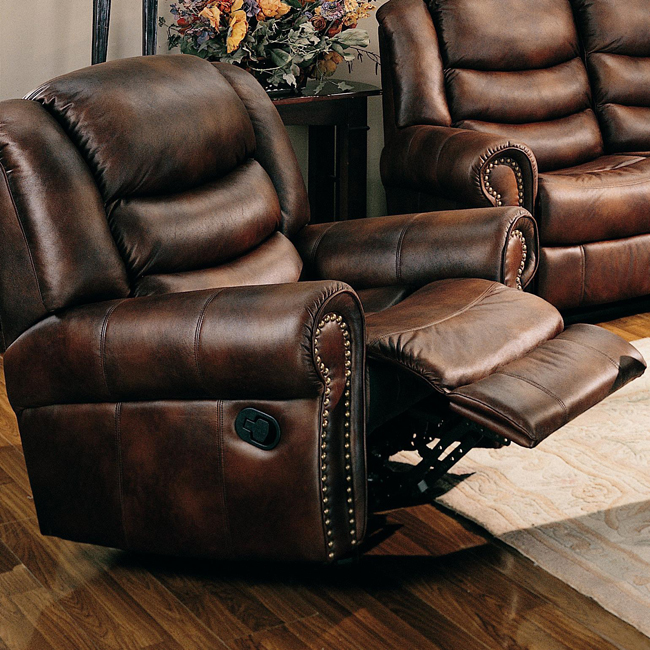 This traditional rocker recliner offers not one, but two ways to relax. Comfortable padded seat backs and rolled arms combine with unique rock and recline features for superior comfort and relaxation. An exterior handle makes for easy release of the chair's reclining feature. Eye catching brass look nailhead trim frames the rolled shape of the armrests and combines with a durable leather like fabric in a warm brown. Use alone in your bedroom or den, or pair with the matching dual recliner love seat and chair for a warm and inviting traditional living room.