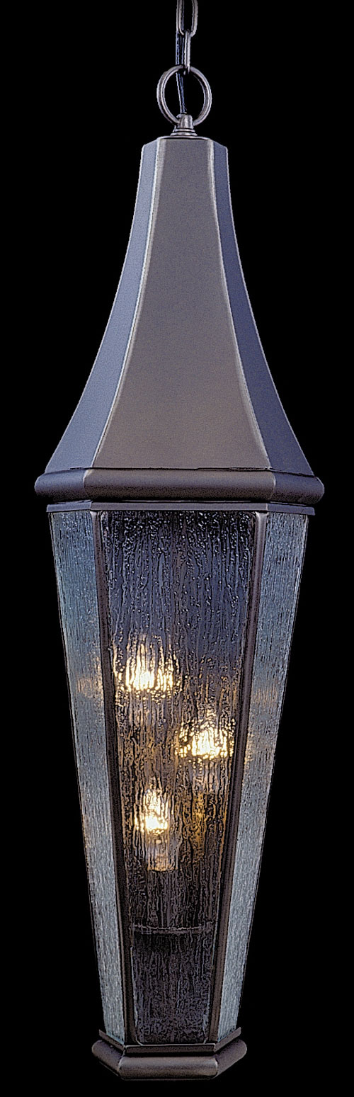 The tall slender roof and cage make a pronounced statement with an almost fairy-tale like effect. The distressed glass adds an Old World feel and refracts the bulb filament. The metal components are all solid brass. Also available with fluorescent ballast upon request.