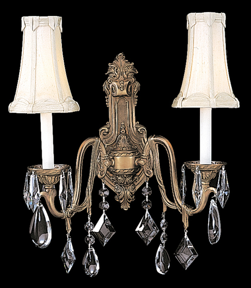 These chandeliers are made of all cast components draped with several different shapes of hand-cut Austrian crystal. The draping effect on the cast arms and center arms are complementary and add a casual element to an otherwise ornate carriage. The black and beige shades are both silk.