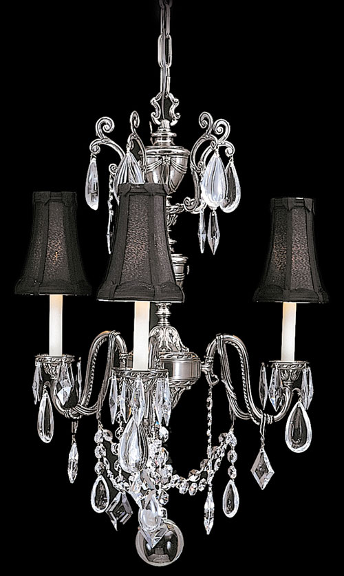 These chandeliers are made of all cast components draped with several different shapes of hand-cut Austrian crystal. The draping effect on the cast arms and center arms are complementary and add a casual element to an otherwise ornate carriage. The black and beige shades are both silk. Width 24 1/2" Height 31 1/2" Extension 67 1/2" Primary Lamps 3 Primary Lamp Wattage 40 W Primary Lamp Type Candle Clear