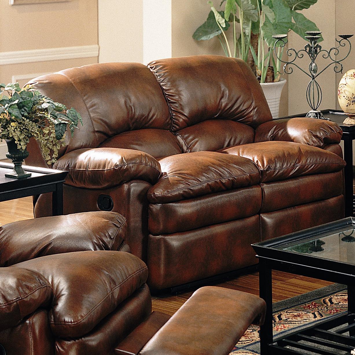 The indulgent look of leather meets the casual comfort of a recliner in this dual reclining love seat. Exterior handles allow for effortless open and closure of the reclining seats, while padded armrests and overstuffed pillow seats and seat backs further enhance your comfort. Accent stitching on the back lends a casual feel to the love seat's front, and a durable bonded leather wraps the entire piece for a casually elegant look. Bonded leather makes for a durable and lasting love seat that has all the luxurious appeal of leather with easy care capabilities for a truly livable living room set. The indulgent look of leather meets the casual comfort of a recliner in the Walter motion collection. This fantastic sofa, love seat and chair set offers the leather look you love with the easy care capabilities of a beautiful bonded leather. A dual reclining sofa and love seat are composed of overstuffed pillow style seats and padded armrests for ultra comfortable seating. A matching rocker recliner continues the casual, overstuffed appeal of the love seat and sofa and offers a dual rocker and recliner Features for enhanced comfort. Take home the Walter motion collection for a casual and comfortable living room designed with your comfort in mind.
